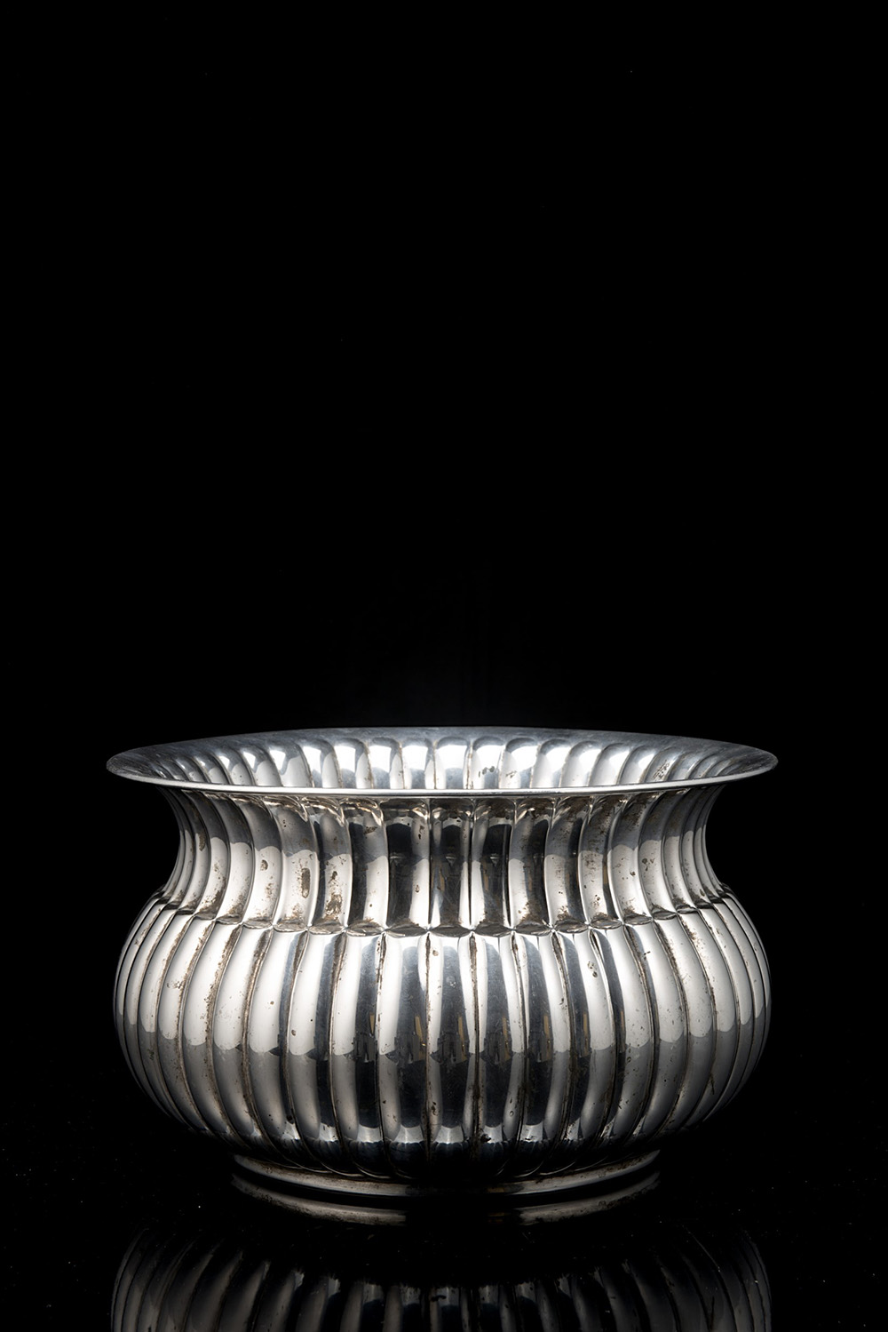 Cachepot in argento di forma circolare con corpo a baccellature e fesonature verticali. Italia, sec. XX (h. cm 18; d. cm 30) (gr 2000 ca.) (lievi difetti) Silver cachepot. Italy, 20th century (minor defects)