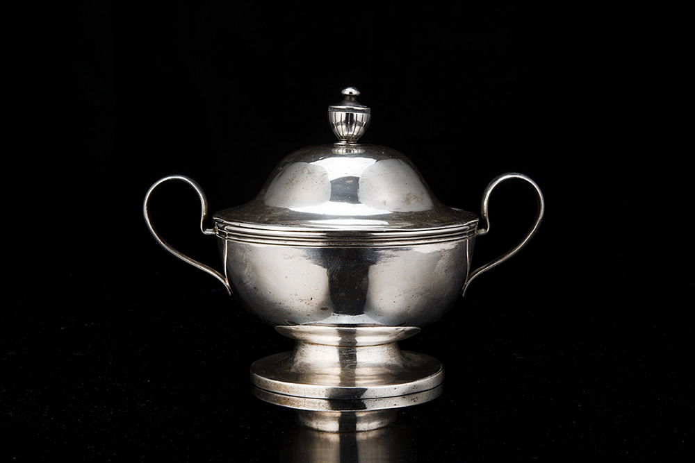 Zuccheriera biansata in argento a due manici con coperchio di forma circolare e superficie liscia. Presa ad urna. Germania, inizio sec. XIX (h. cm 14,5) (gr 760 ca.) Silver sugar bowl. Germany, early 19th century