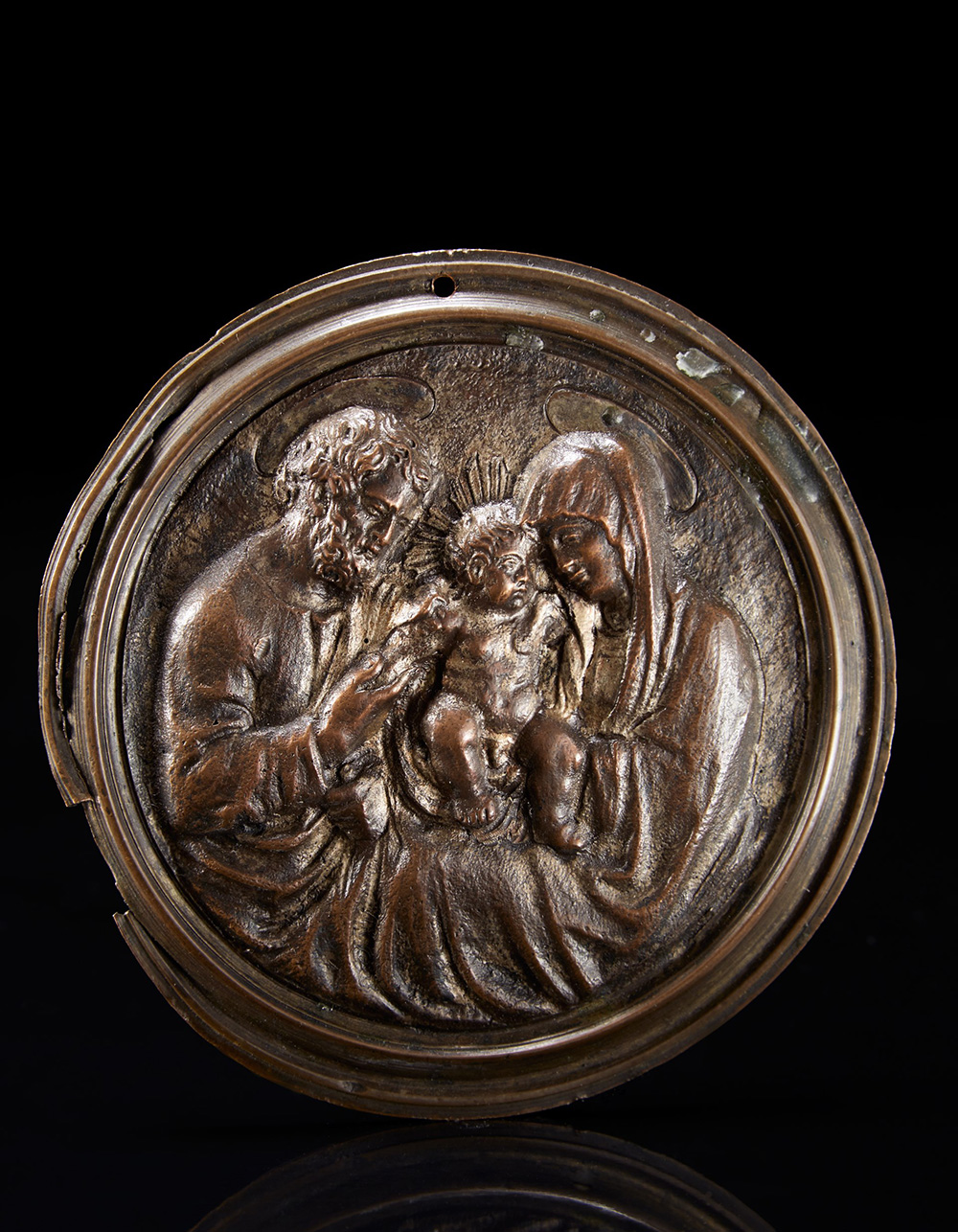 Arte della fine del sec. XVI "Sacra Famiglia" placca in bronzo (d. cm 11,2) (difetti e mancanze) "The Holy Family" bronze plaque. Late 16th century (defects and losses)