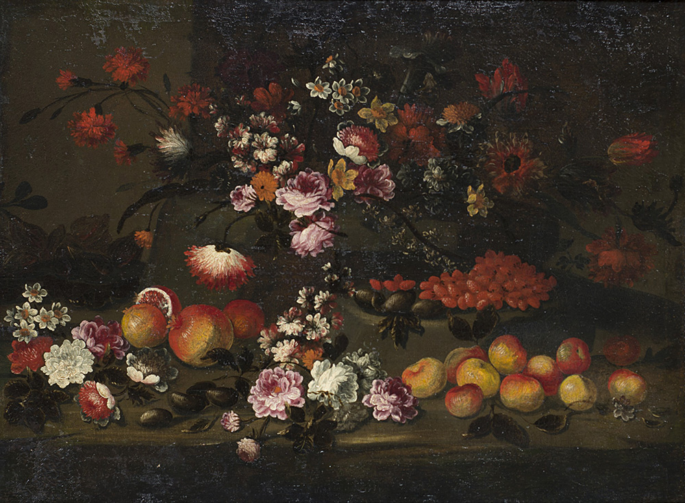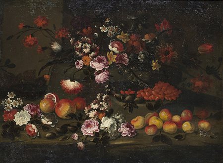 Antico dipinto "Natura morta con fiori e frutta" olio su tela (cm 86.5x115)...