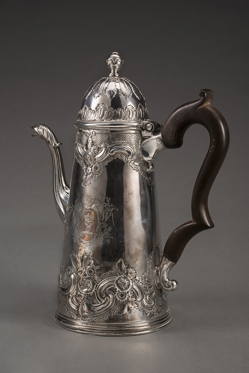 Caffettiera in argento con corpo sbalzato a volute fogliate, fiori e inciso a stemma. Beccuccio zoomorfo, presa del coperchio a pigna stilizzata, ansa in legno sagomato. Inghilterra (gr lordi 1000) (difetti) English silver coffe pot (defects)