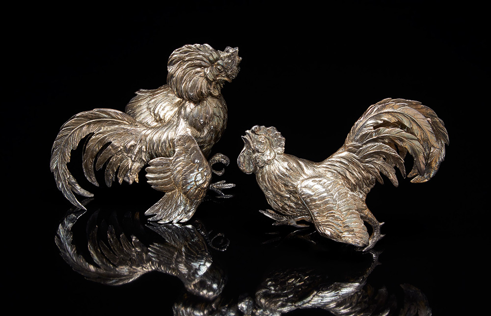 Coppia di sculture in argento a forma di galli in combattimento. Germania, inizio sec. XX (h. max cm 14) (gr 600 ca.) (lievi difetti) A pair of silver rooster sculptures. Germany, early 20th century (minor defects)