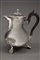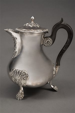 Caffettiera in argento a corpo liscio poggiante su tre piedini decorati a...