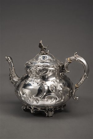Teiera di forma bombata in argento sbalzato a foglie e fiori, iscritta in un cartiglio, presa del coperchio a volatile a tutto tondo, beccuccio zoomorfo con mascherone, ansa sagomata. Argentiere Richard Haedges, Citt‡ di Sheffield, 1852 (h. cm 20) (gr 780) (difetti) Rounded silver teapot. Sheffield, 1852 (defects)