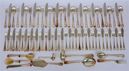 Servizio di posate in argento composto da dodici forchette, dodici coltelli e dodici cucchiai, dodici forchette e dodici coltelli frutta, dodici forchette e dodici coltelli pesce e nove posate da portata (gr 5500 ca.) A silver flatware service