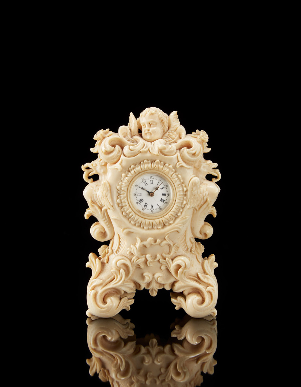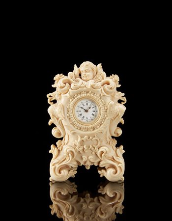 ANONIMO Orologio da tavolo con cassa in avorio scolpito a cherubini, animali fantastici alati e volute Epoca fine sec. XIX inizio sec. XX Quadrante in smalti a numeri arabi e romani Movimento con carica giornaliera a chiavetta, scappamento a cilindro Misura h cm 9,5 Unknown. Carved ivory clock. Late 19th/early 20th century