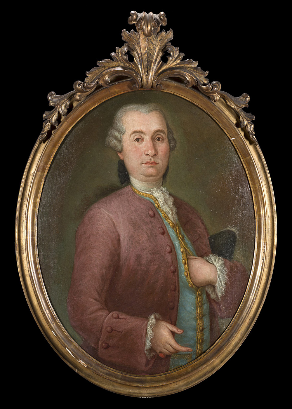 Scuola del secolo XVIII "Ritratto di gentiluomo" olio su tela ovale (cm 92x70) In cornice in legno dorato con cimasa intagliata e traforata (difetti) 18th century school, "Portrait of a Gentleman", oil on canvas. Framed (defects)