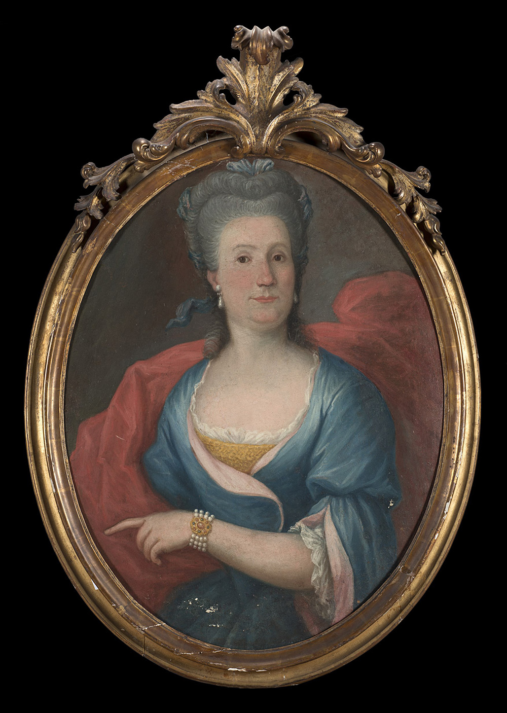 Scuola del secolo XVIII "Ritratto di dama" olio su tela ovale (cm 90x70) In cornice in legno dorato con cimasa intagliata e traforata 18th century school "Portrait of a Lady", oil on canvas. Framed