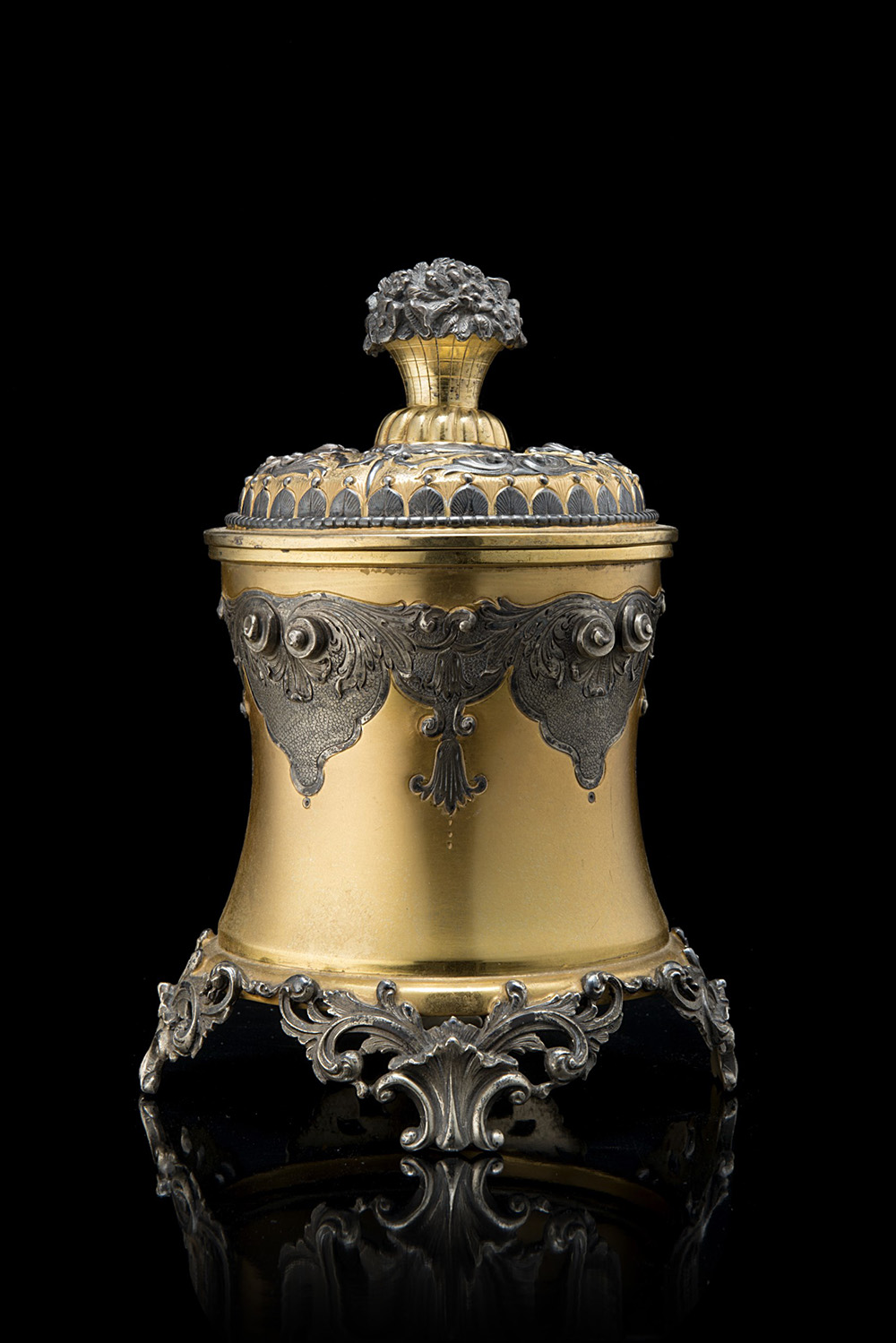 Scatola in argento con coperchio parzialmente dorata a motivi fitomorfi. Presa a bouquet. Milano, sec. XX (gr 770 ca) (h. cm 22) 20th-century part silver-gilt box. Milan