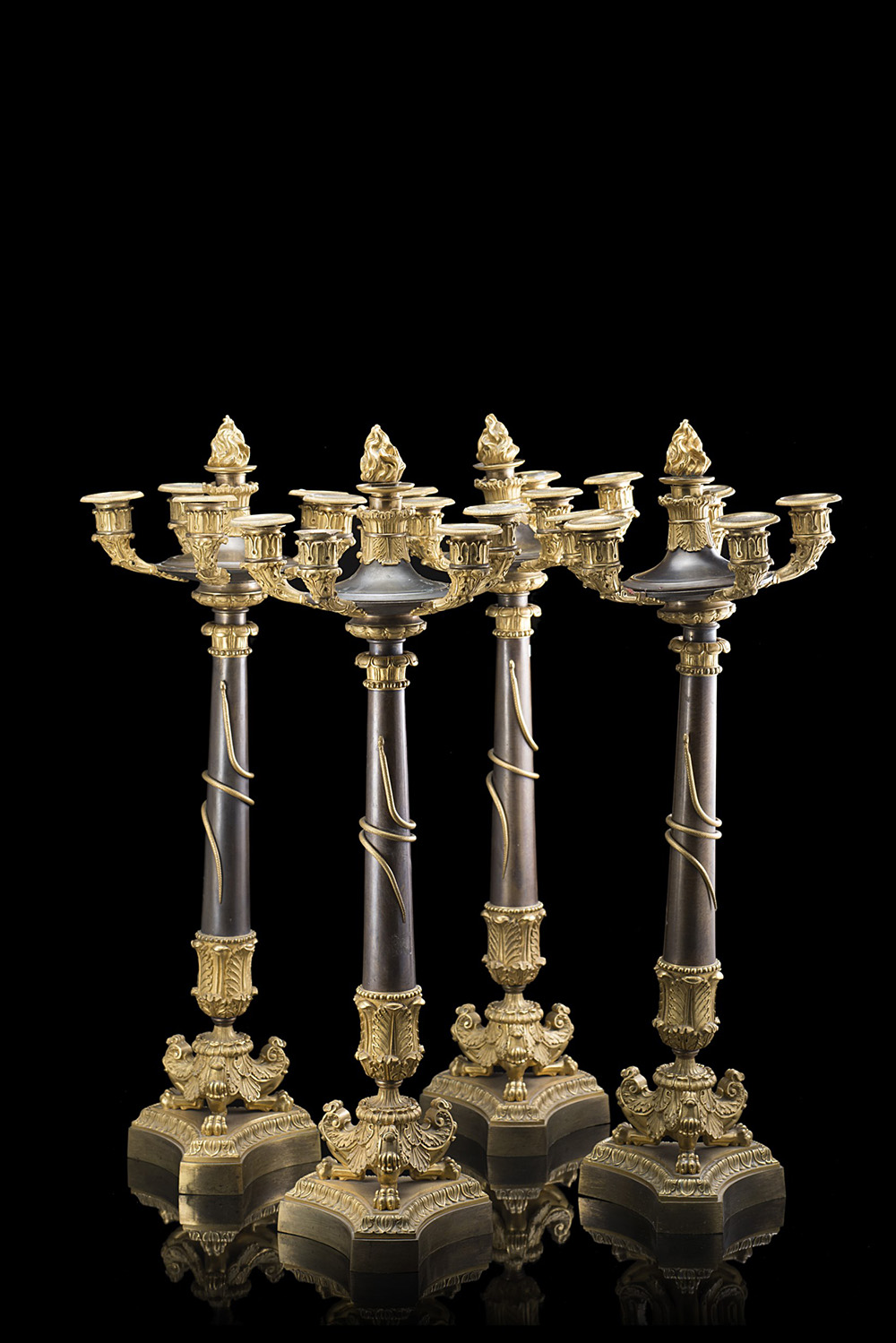 Guarnitura da camino composto da quattro candelieri a sei fiamme in bronzo dorato decorati a motivi fogliati e puntale a forma di fiamma. Corpo in bronzo brunito decorato con serpente avviluppato. Base tripode decorata a volute e foglie. Piedi ferini (h. cm 66) Prima met‡ del sec. XIX (lievi difetti) Early 19th-century four-piece garniture (minor defects)