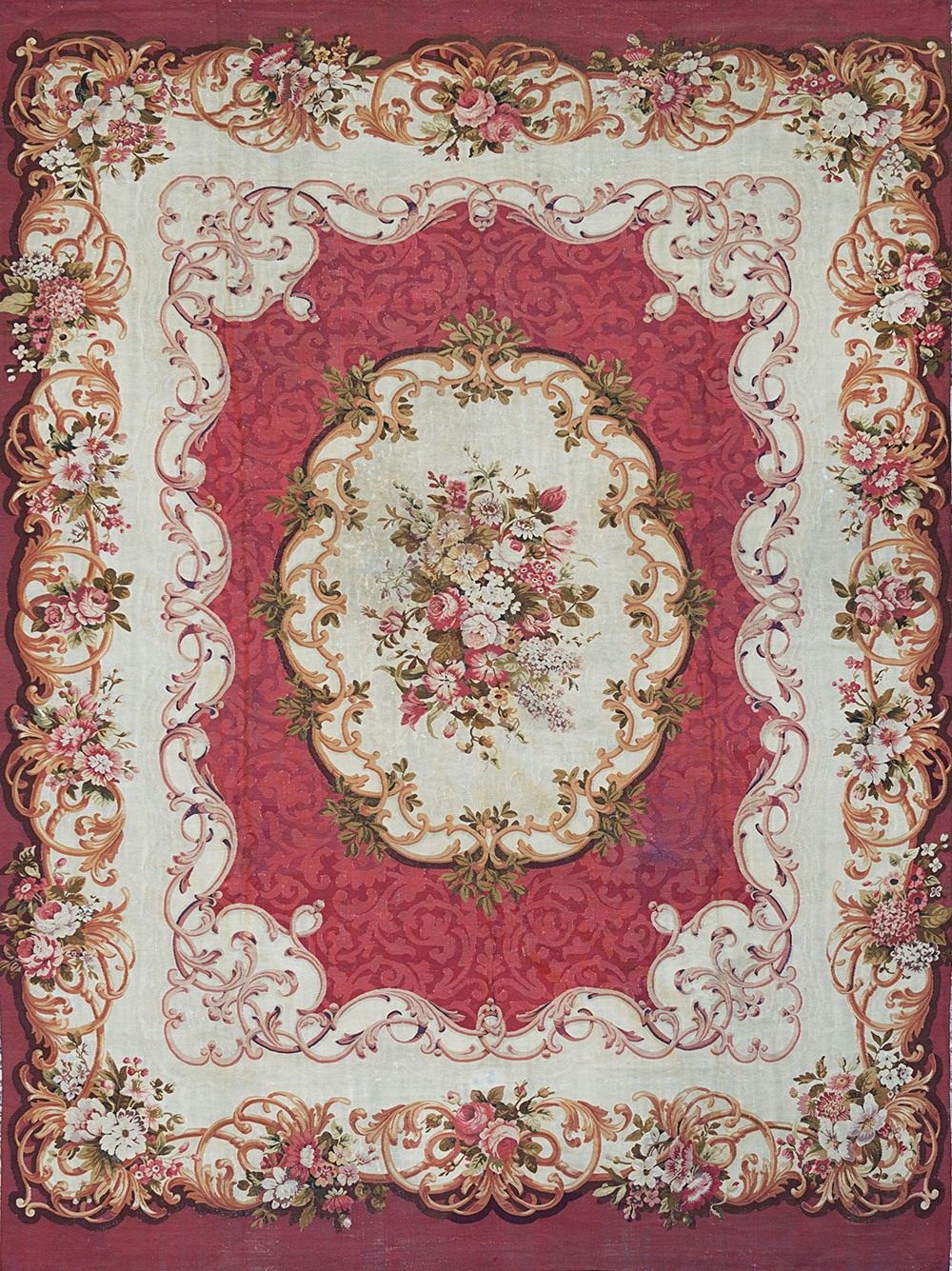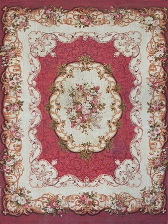 Tappeto Aubusson, Francia, seconda met‡ secolo XX. Decoro a medaglione a fondo bianco con bouquet di fiori policromi su campo bordeaux decorato a racemi tono su tono. Bordura bianca con volute e mazzi di fiori, cm 453x347 (macchie e difetti) Aubusson carpet, France, second half of the 20th century. (defects and stains)
