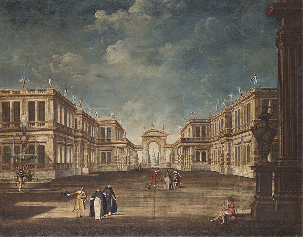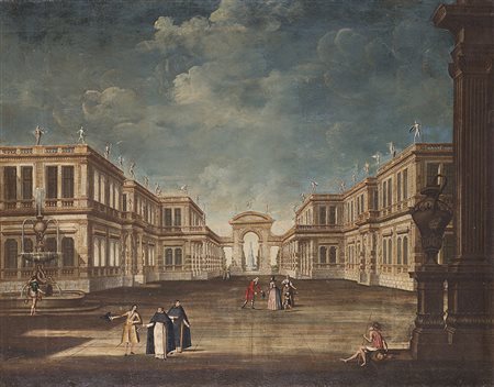 Scuola del secolo XVIII "Paesaggio con architetture e personaggi" olio su...