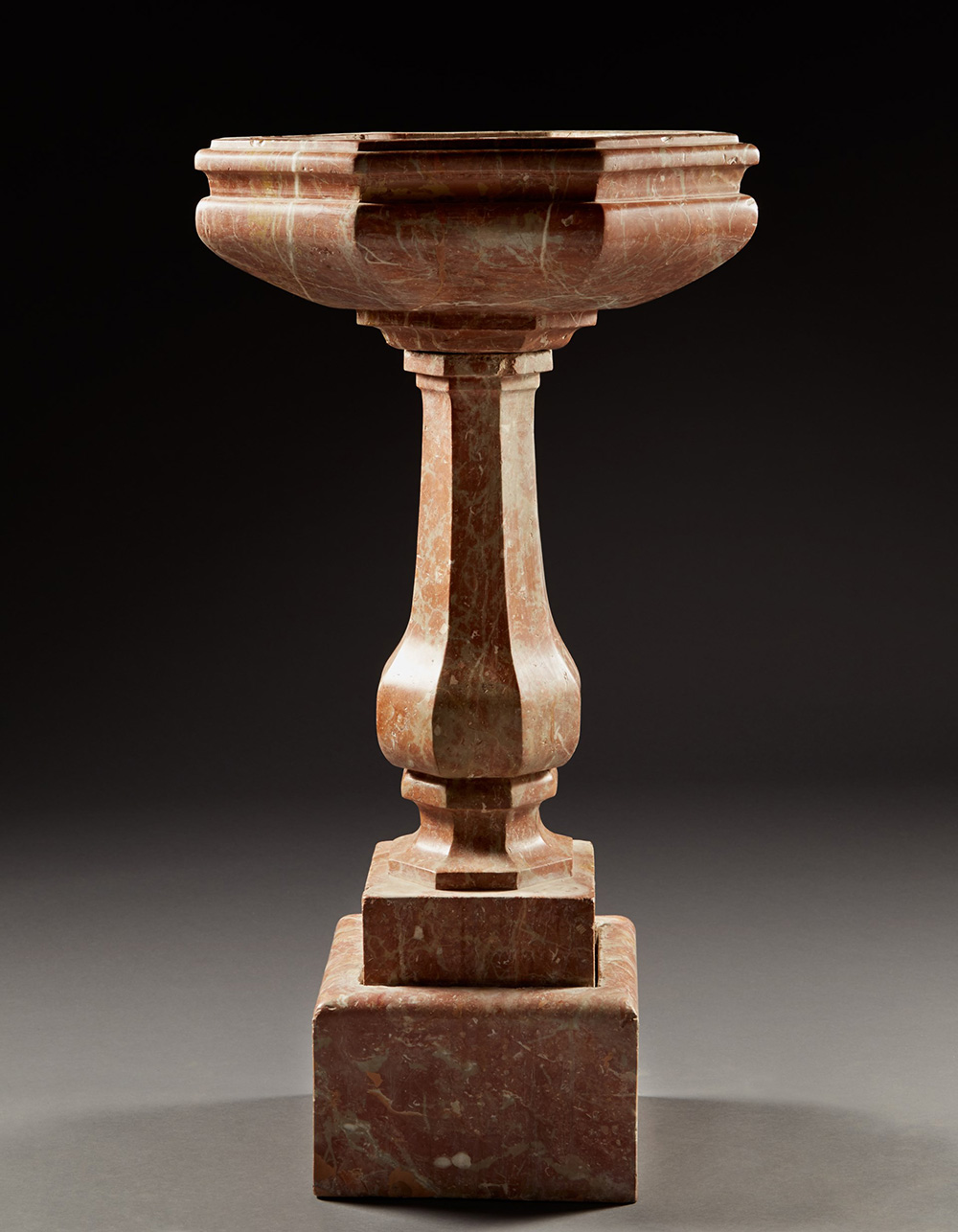 Acquasantiera in marmo rosa con vasca di forma ottagonale, colonna sfaccettata poggiante su base a plinto (cm 56x110x56) Sec. XIX (lievi difetti) 19th-century marble holy water font (minor defects)