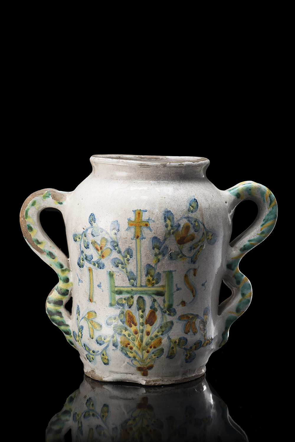 Vaso in maiolica a corpo cilindrico con due anse a doppio occhiello. Decorazione policroma con ghirlanda vegetale con cartiglio a nastro con la scritta ëS.te Teresia 1618í e dalla parte opposta trigramma bernardiniano ëIHSí sormontato da croce (h. cm 21) Italia centrale, sec. XVII (sbeccature, cadute di smalto e difetti di cottura) Two-handled majolica vase. Central Italy, 17th century (chipping, losses, and defects)