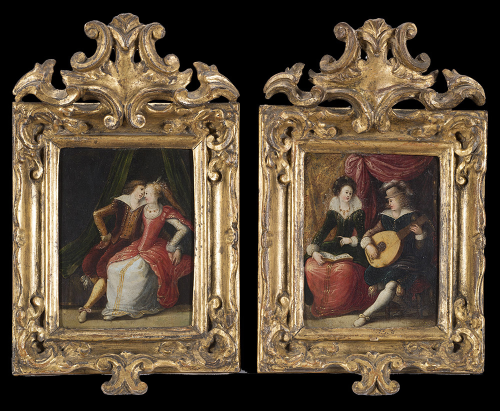 Scuola del sec. XVIII "Scena galante" coppia di miniature su rame (cm 13x10) In cornici in legno intagliato e dorato (lievi difetti) Early 19th-century school "Scene galante" a pair of miniatures on copper. Framed (minor defects)