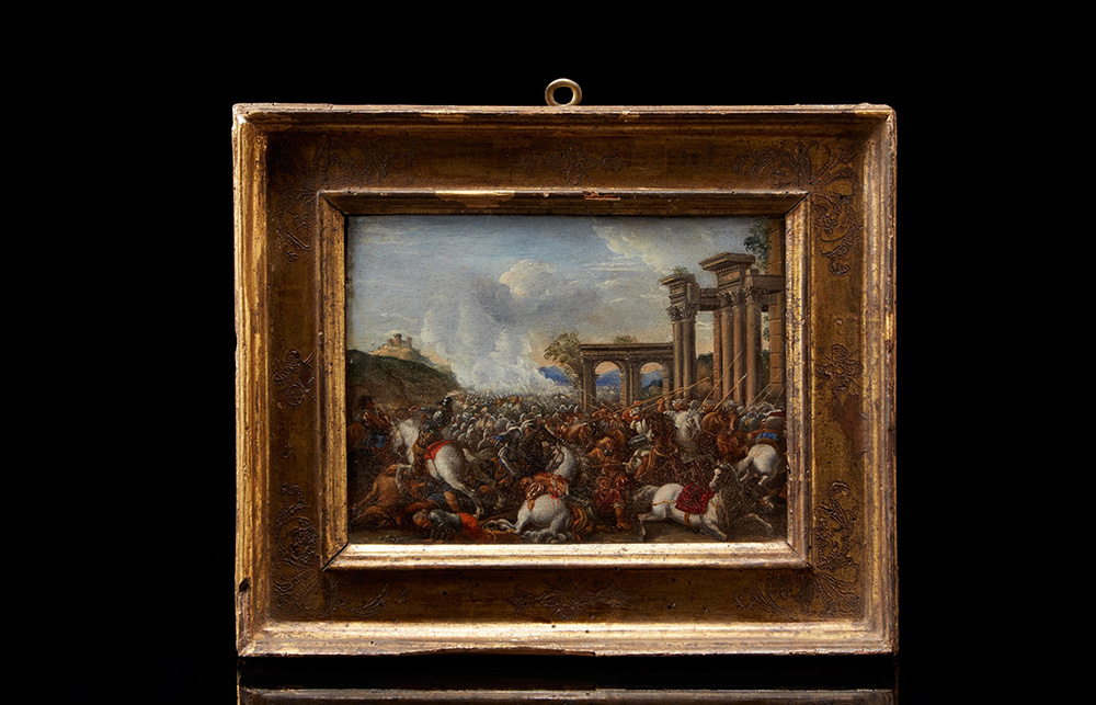 Maestro della fine del sec. XVII "Battaglia fra turchi e cristiani" olio su rame (cm 17x22) In cornice dell'epoca Late 17th-century master "A battle between Turks and Christians" oil on copper. Coeval frame