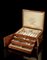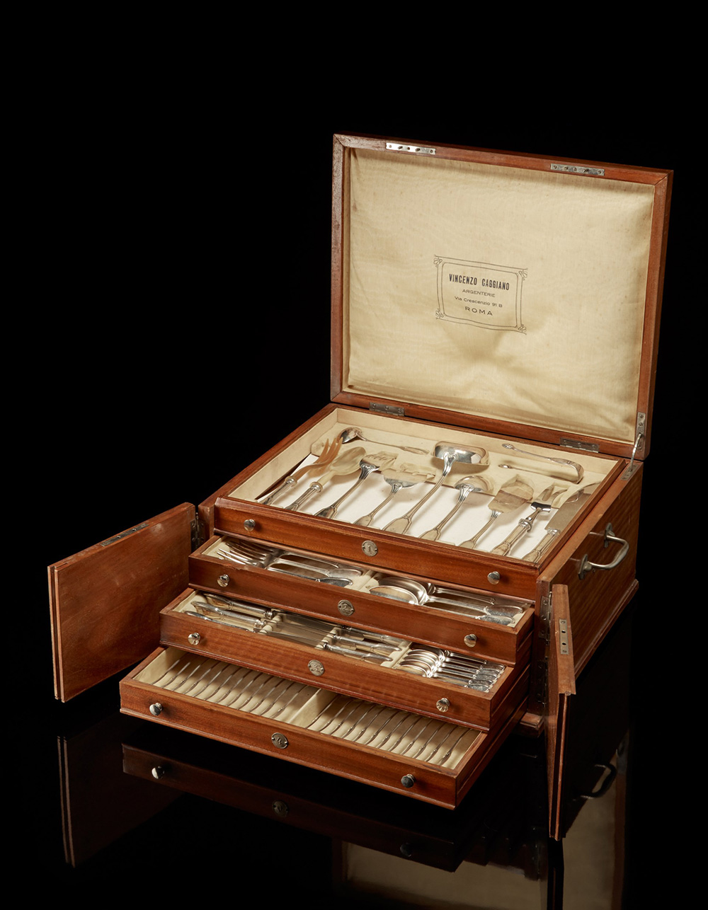 Servizio di posate in argento composto da dodici forchette, cucchiai e coltelli, dodici forchette, cucchiai e coltelli da frutta, dodici forchette e coltelli da pesce e undici posate varie da portata. Italia, inizio del sec. XX. In custodia in legno con intarsio (gr 6000 ca.) (difetti) Silver flatware service for twelve. Italy, early 20th century. with wooden case (defects)