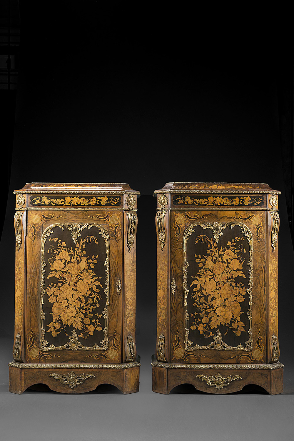 Coppia di stipi lastronati in legni vari con fronte e fasce intarsiati in legni vari a volute e fiori. Fianchi filettati, montanti e profili in bronzo a mascheroni e motivi vegetali. Piedi squadrati. Sec. XIX (cm 77x128x39) (difetti) A pair of 19th-century cabinets veneered in different woods (defects)