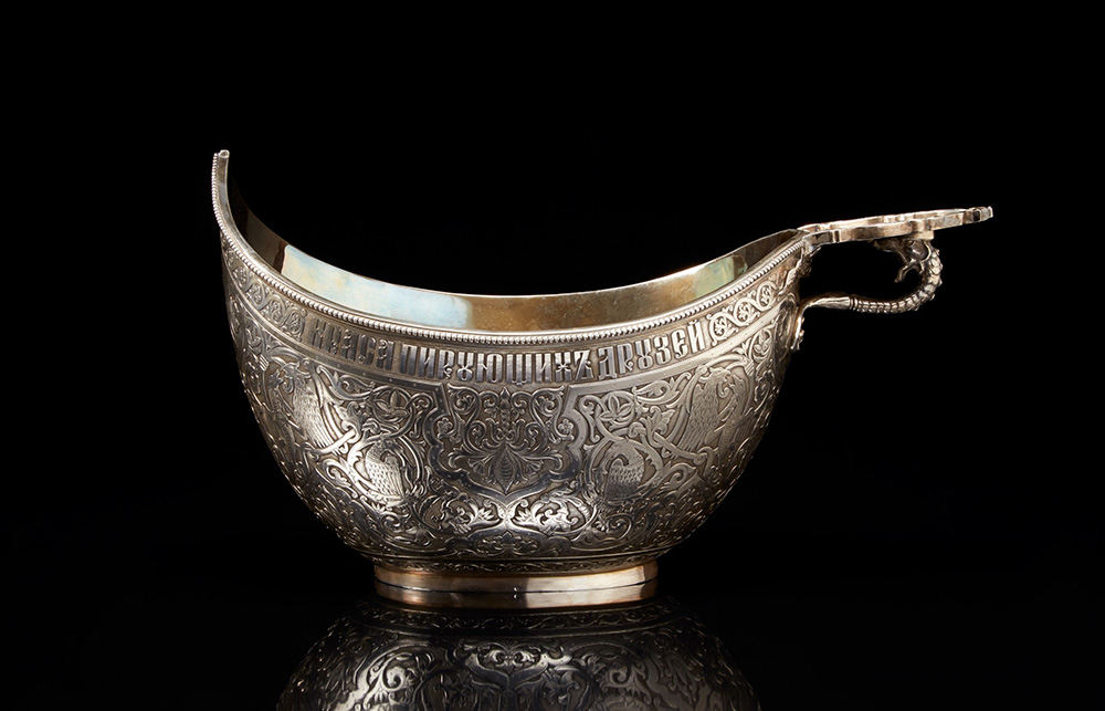 Grande Kovsh in argento a forma di barca, cesellato a bassorilievo con volute...
