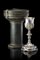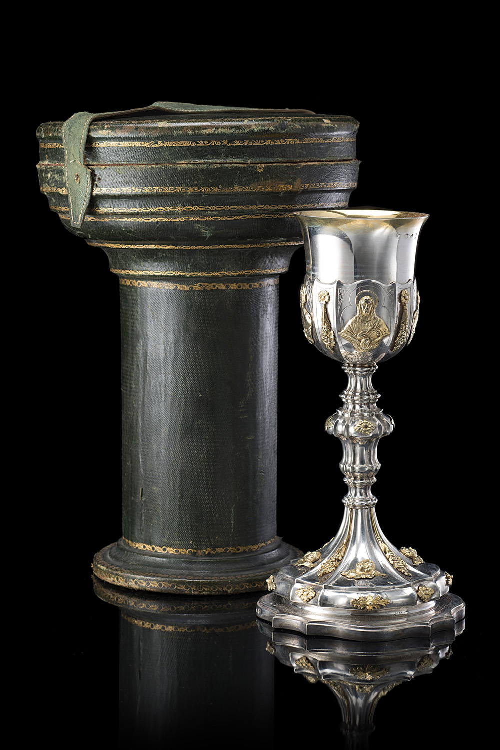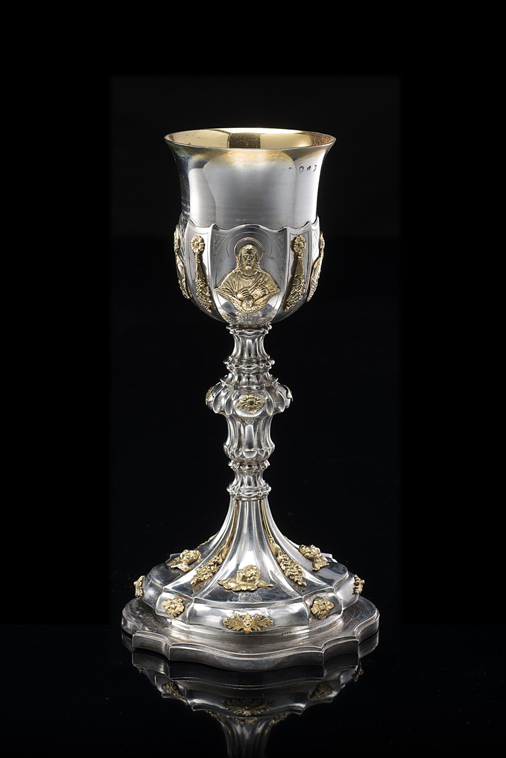 Calice in argento quadripartito a nervature verticali; piede mistilineo bombato, base, fusto e sottocoppa decorati con applicazioni in argento dorato di fiori, cherubini, festoni e quattro evangelisti. In custodia. Argentiere LM. Regno Lombardo-Veneto, Padova sec. XIX (h. cm 25) (gr 540 ca.) (lievi difetti) Silver chalice. Lombardo-Veneto Reign, Padua (minor defects)