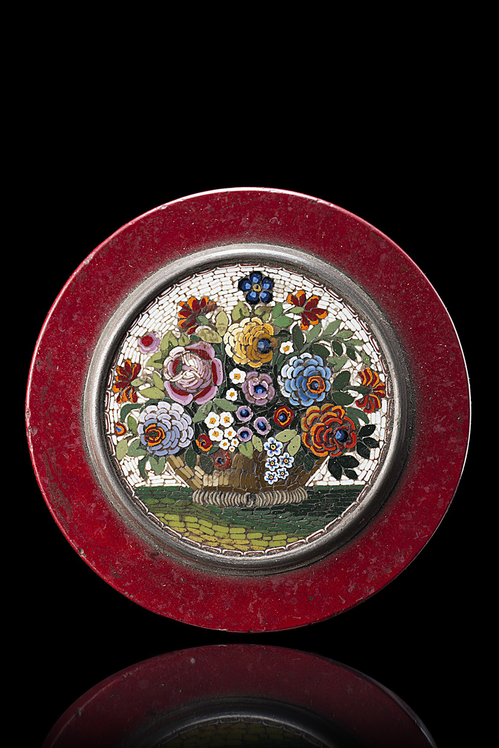 Lotto 1026 | Micromosaico raffigurante un cesto di fiori montato su coperchio (d. cm 4)...