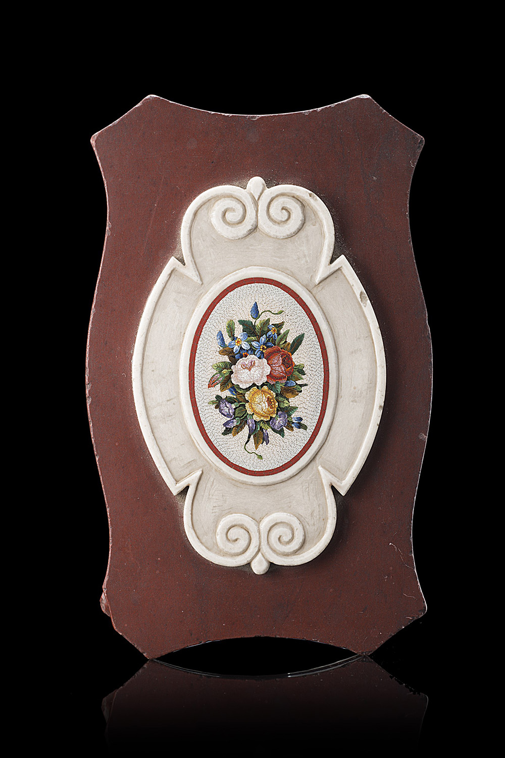Micromosaico raffigurante fiori montato su placca in marmo bianco di forma mossa. Base in marmo rosso. Roma, fine sec. XIX (cm 15,5x9) (difetti) Late 19th-century Roman micromosaic on marble top (defects)