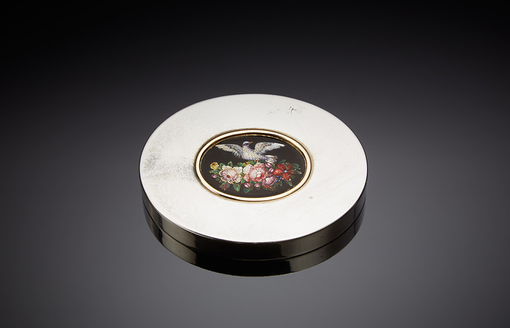 Placca in micromosaico policromo a trionfo floreale sormontato da colomba ad ali spiegate. Sec. XIX (cm 4x3) Montato su fermacarte in argento. Tit. 925. Dedicato al retro. Provenienza: Petochi, Roma (cm 9x8) (gr. lordi 250) 19th-century polychrome micromosaic on silver paperweight