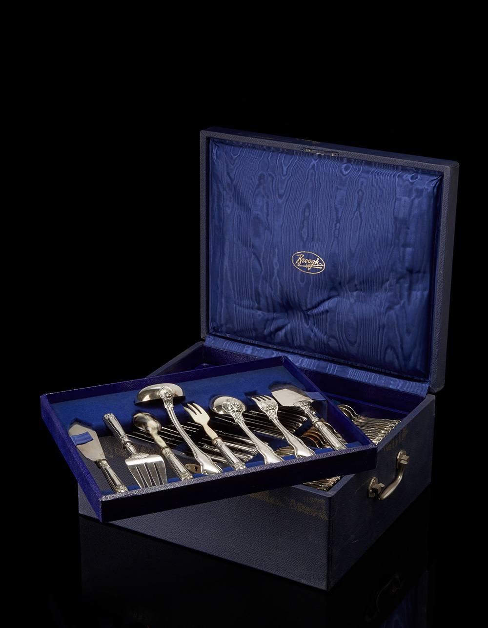 Servizio di posate in argento composto da dodici forchette, cucchiai e coltelli, dodici forchette, cucchiai e coltelli da frutta, quattordici forchette e coltelli da pesce, dodici cucchiaini da dessert, dodici cucchiaini da thË e otto posate a servire. Argentiere Broggi. In custodia (gr 8000 ca.) Silver flatware part- service, Broggi Silversmith. With case