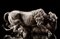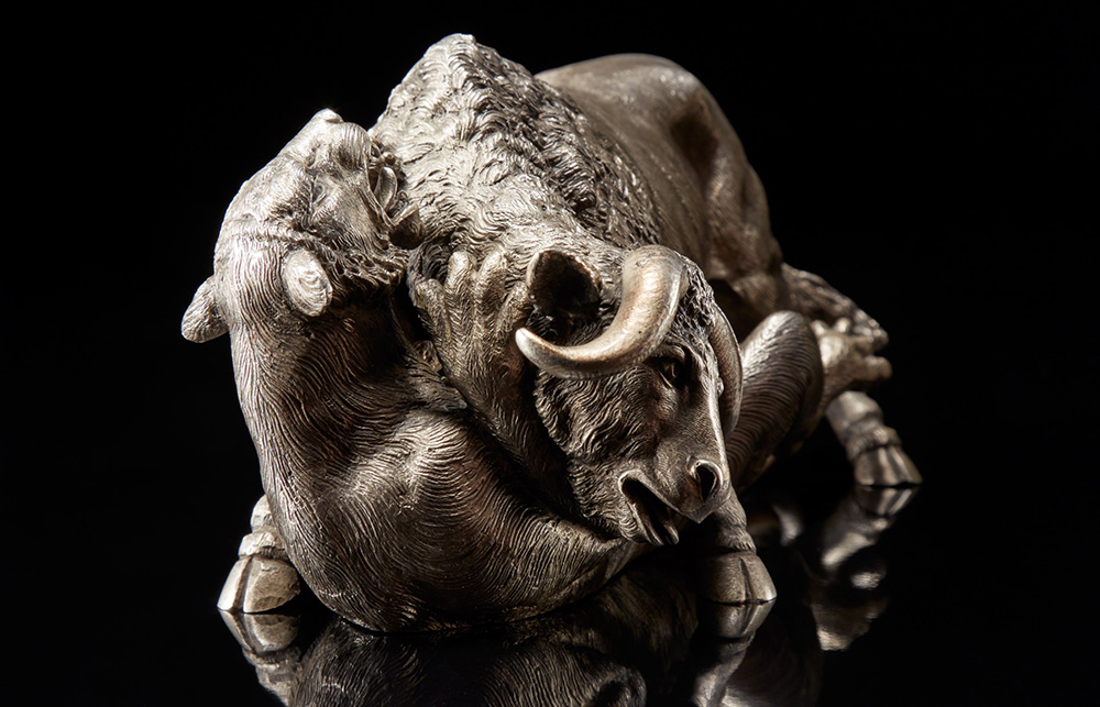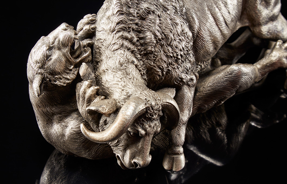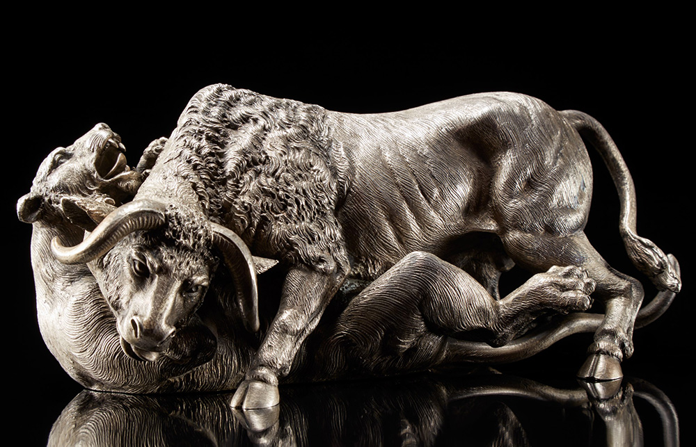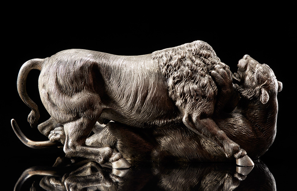 Scultura in argento raffigurante bufalo e leonessa in scena di predazione....