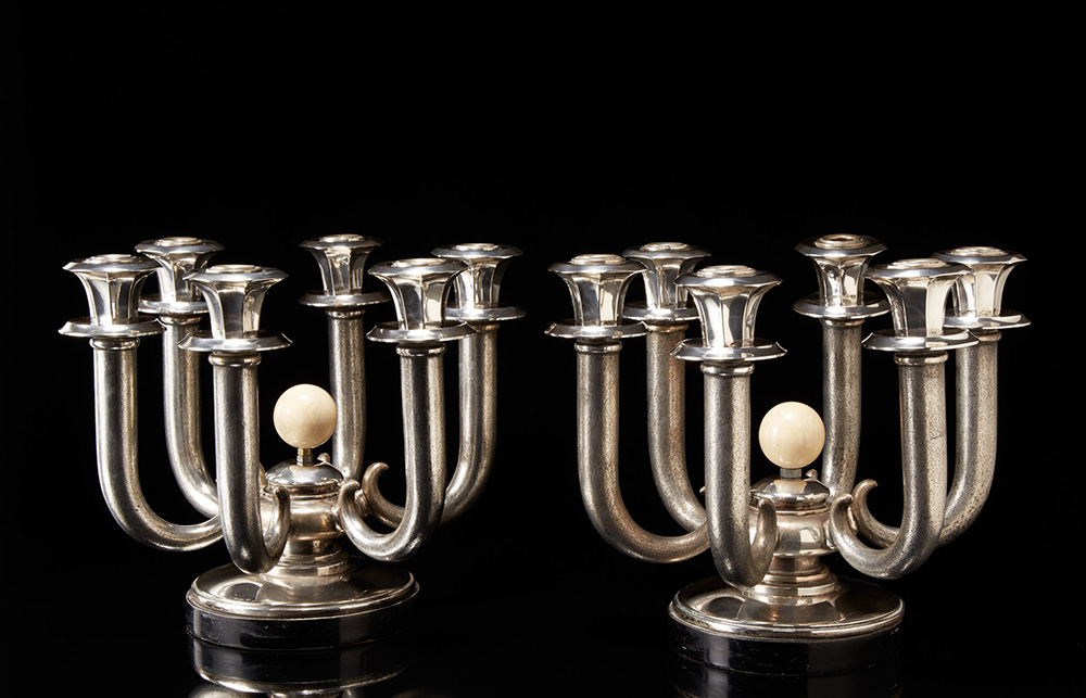 Coppia di candelabri a sei fiamme in argento. Base circolare su plinto in legno. Rocchetto centrale tornito, gradinato e sormontato da sfera in avorio coeva, che raccorda sei bracci a calice ricurvo satinati. Piatti raccoglicera circolari, bobeches svasate e sfaccettate. Milano, anni '30. Fratelli Genazzi (h. cm 25,5x d. cm 32) (gr 3600 ca.) (difetti) A pair of silver candelabra. Fratelli Genazzi Silversmiths Milan, 1930s (defects)