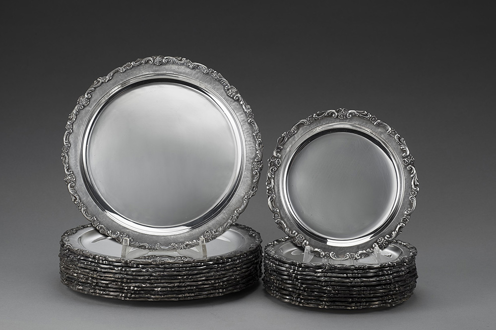 Ventiquattro piatti in argento con bordura applicata a volute e motivi...