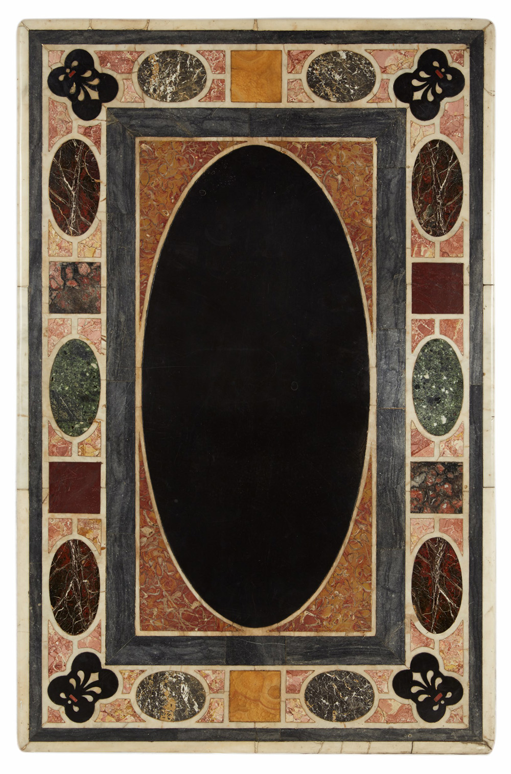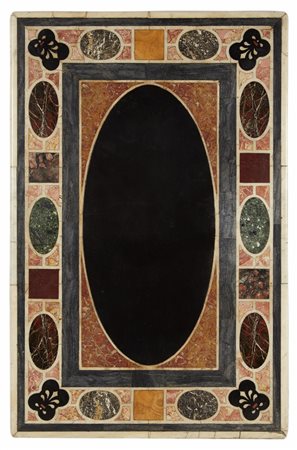 Antico piano lastronato e intarsiato a motivi geometrici e volute in marmi diversi, decorato al centro da ovale in marmo nero. Base in legno con fascia intagliata e quattro gambe scanalate unite da traverse tornite, di epoca posteriore (cm totali 140x77x89) (lievi difetti e restauri) Antique top inlaid with various marbles. Wooden base of a later date (minor defects and restorations)