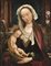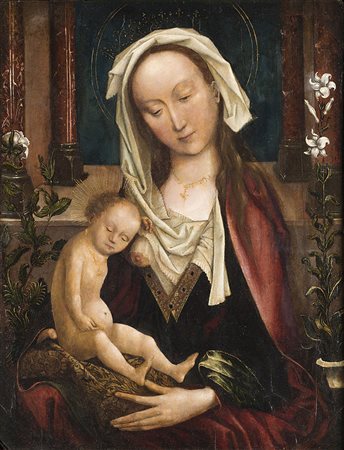 Maestro tedesco del secolo XVII "Madonna con bambino e fiori" olio su tavola (cm 63x49,5) In cornice (restauri e ridipinture) 16th-century German master "Virgin and Child with Flowers" oil on panel (cm 63x49,5) Framed (restorations)