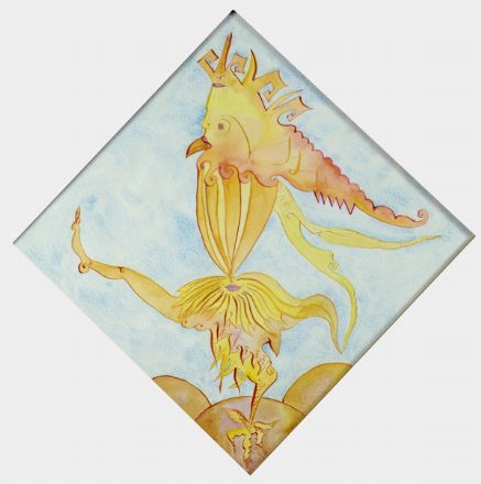 Luigi Ontani (Vergato, 1943) GALLANGELO GIALLO, (1994) Acquerello su carta, cm. 41x41 Sul verso: firma e titolo; etichetta galleria Menhir, Sarzana; etichetta Studio Cavalieri, Bologna; timbro Collezione Belmonte, Bologna; etichetta Artefiera, Bologna, 2000.