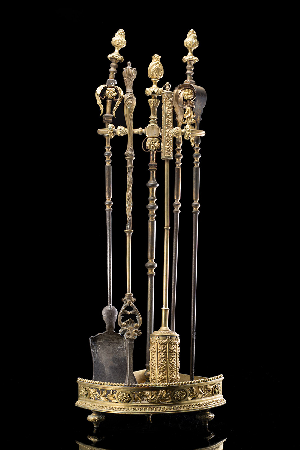 Set da camino in bronzo dorato decorato a motivi vegetali e ferro composto da cinque pezzi di misure diverse. Sec. XIX 19th-century gilt bronze five-piece fireplace tools
