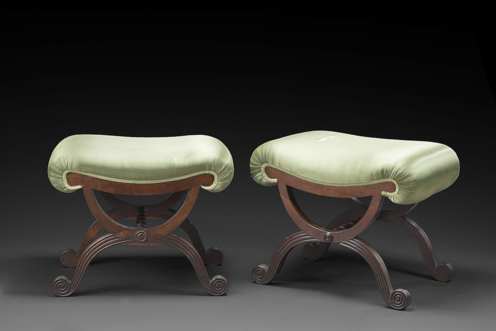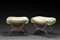 Coppia di sgabelli con gambe incrociate e scanalate riunite da traversa...