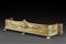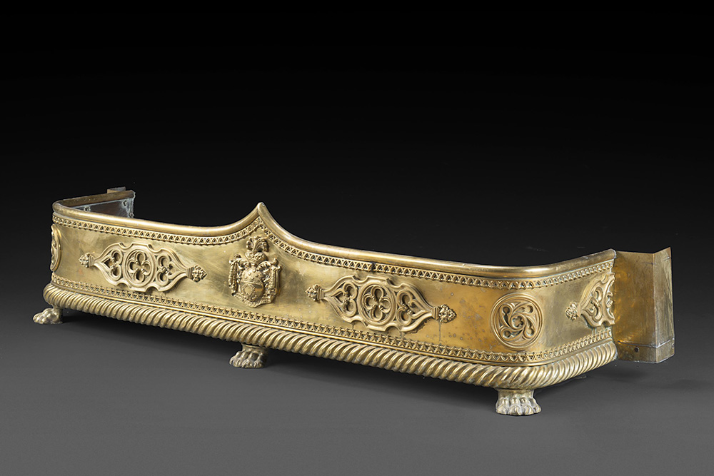 Ringhiera da camino di forma sagomata in ottone e bronzo decorata da stemma nobiliare al centro e motivi geometrici sui lati. Piedi a zampa leonina. Sec. XIX (difetti) 19th-century brass and bronze fire fender (defects)