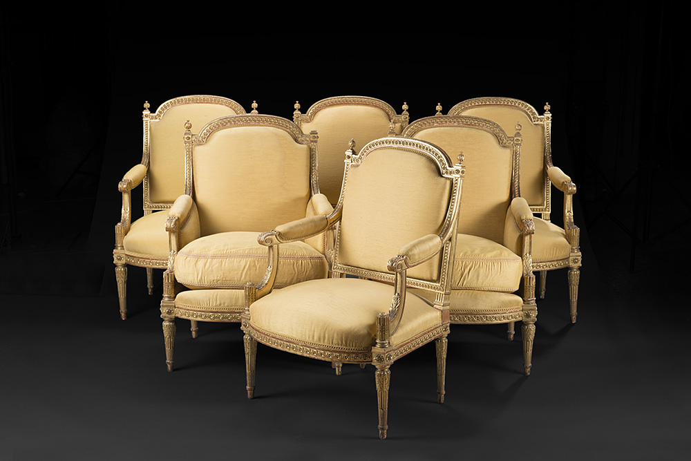 Gruppo di sei poltrone in legno dorato interamente intagliate a motivi vegetali rosoni e perlinature. Schienale sagomato decorato da pinnacoli, braccioli e montanti mossi. Piedi torniti e scanalati. Sec. XIX (mancanze) Group of six carved giltwood armchairs. 19th century (mancanze)