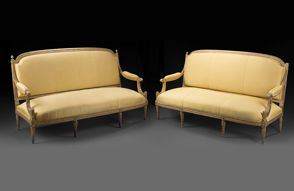 Coppia di divani in legno dorato interamente intagliati a motivi vegetali e perlinature. Schienale sagomato decorato da pinnacoli, braccioli e montanti mossi. Piedi torniti e scanalati. Sec. XIX (mancanze) A pair of carved giltwood sofas. 19th century (losses)
