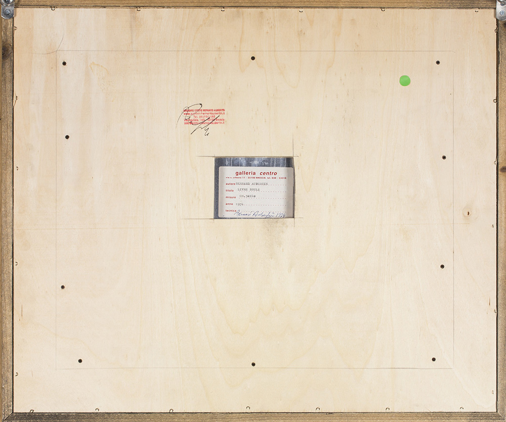 Etichetta della Galleria d'Arte Centro (BS) al retro, con firma e datazione dell'Artista
