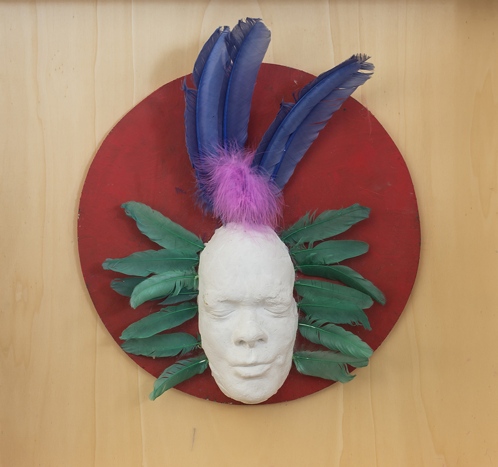 Acrilici su tavola, gesso e piume in teca di legno e vetro