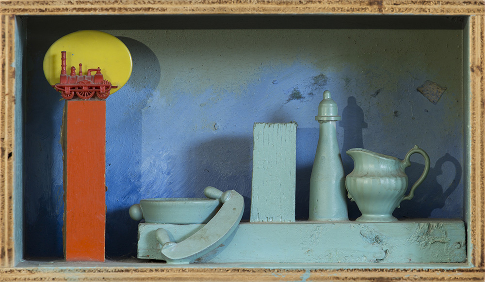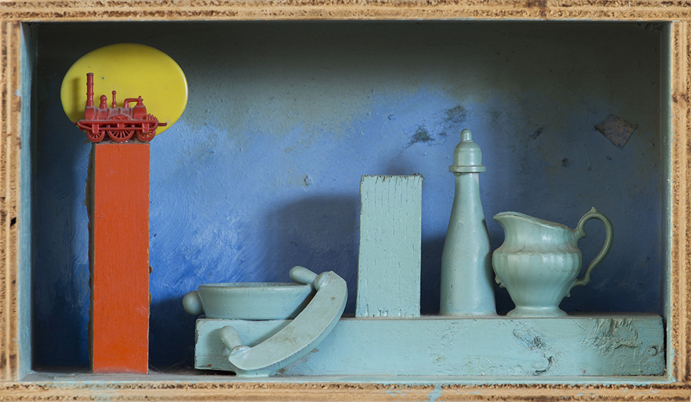 Acrilici e tecnica mista su scatola di legno e assemblaggio