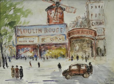 Michele Cascella (Ortona, 1892 - Milano, 1989) MOULIN ROUGE, 1951 Tecnica mista su carta, cm. 49x62 Firma, luogo e data in basso a destra.