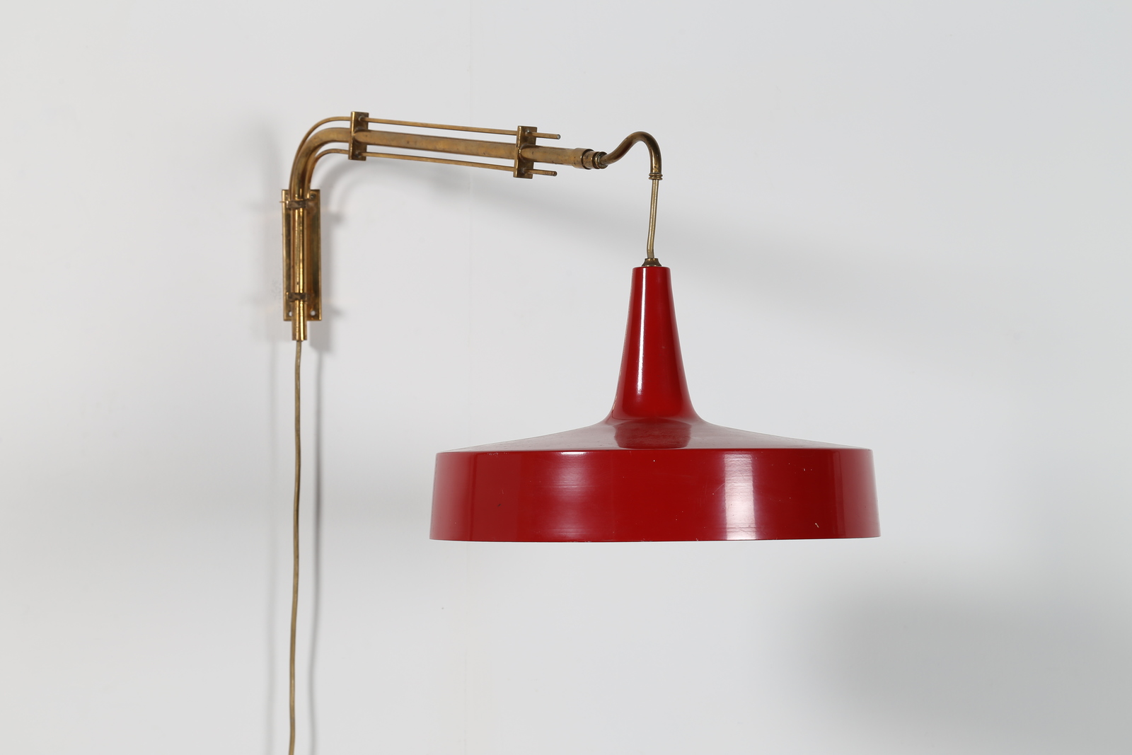 MANIFATTURA ITALIANA Lampada estensibile da parete in ottone e metallo laccato rosso, anni 50. Ottone e metallo laccato. Cm 39,00 x 50,00 x 120,00.