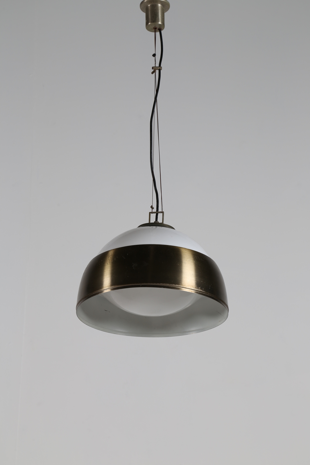 PIANON ALESSANDRO Coppia di lampade a sospensione in vetro lattimo con calotta paralume in alluminio spazzolato mod. a324 Ischia, per Candle, gruppo Fontana Arte, anni 60 . -. Cm 38,00 x 90,00 x 38,00.