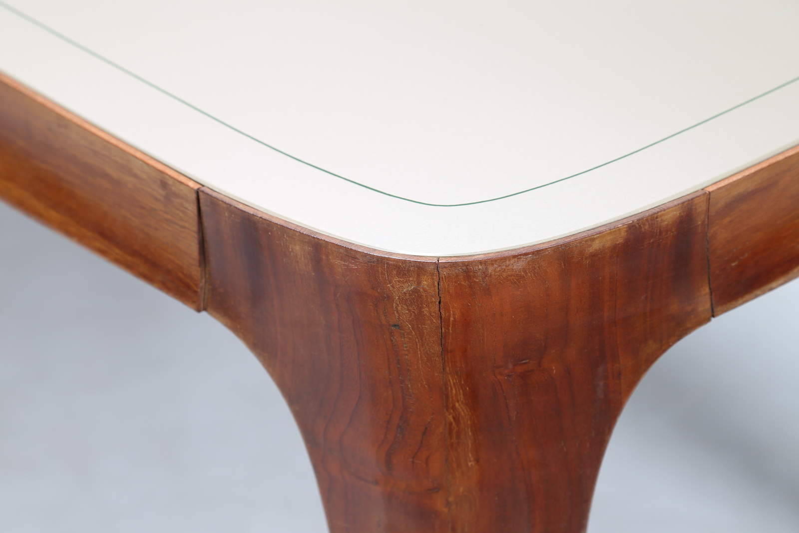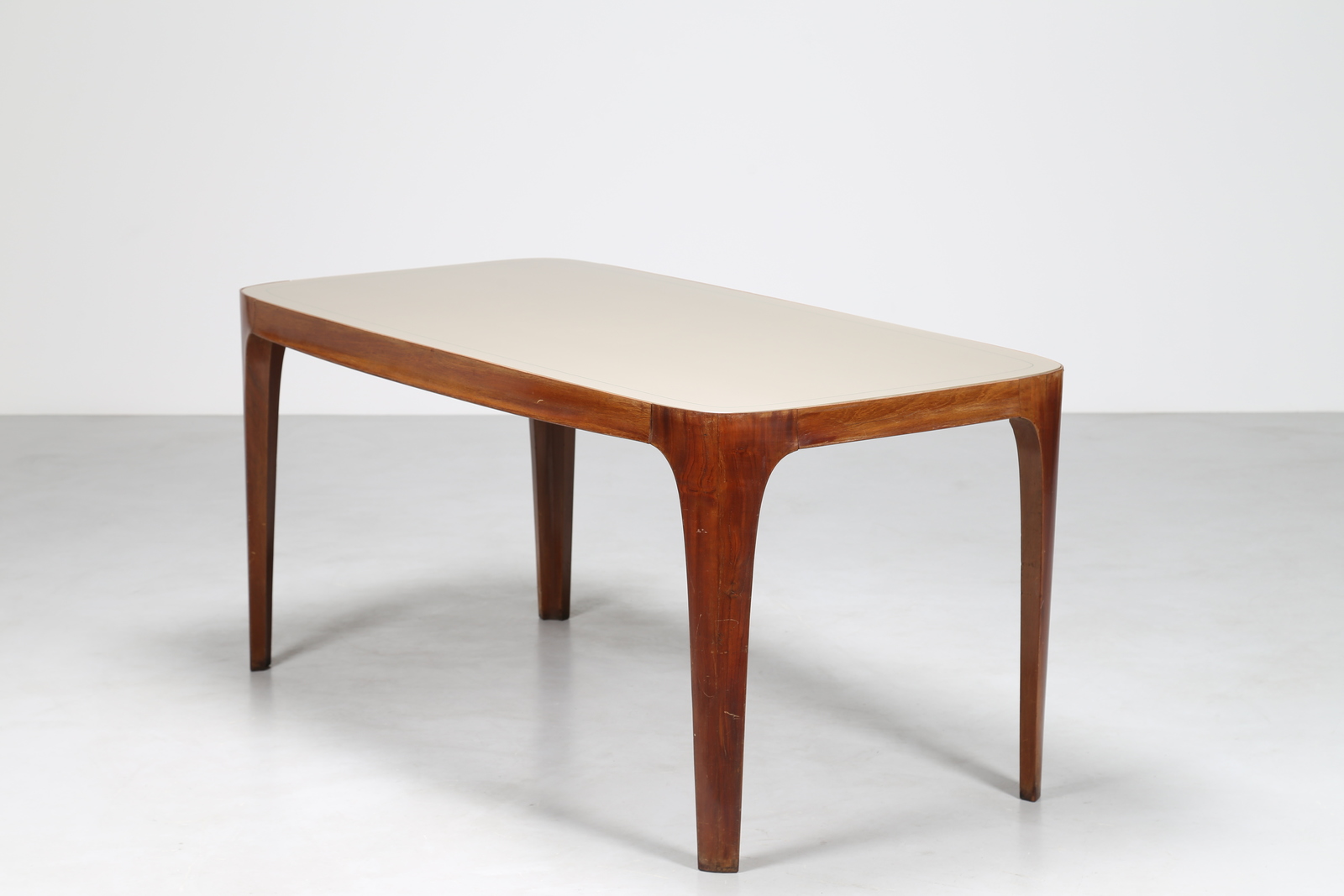 MANIFATTURA ITALIANA Tavolo in noce nazionale con piano in vetro, anni 50°....
