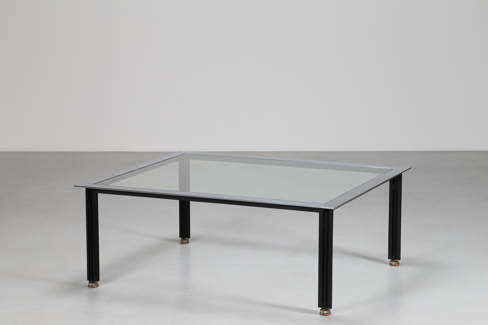 CACCIA DOMINIONI LUIGI (n. 1913) Tavolino in acciaio verniciato e cromato, piano in cristallo e piedini regolabili, mod. T10, per AZUCENA, 1957. Pubblicazioni; Giuliana Gramigna, Repertorio 1950-1980, Mondadori, Milano, 1985, p. 111. . ottone, vetro, ferro. Cm 120,00 x 45,00 x 100,00.