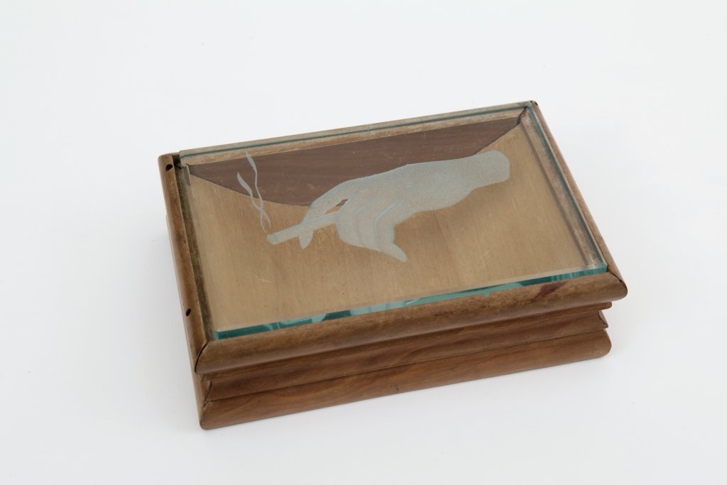 UNA SCATOLA PORTASIGARETTE, anni "40. Legno di noce, cristallo decorato a...