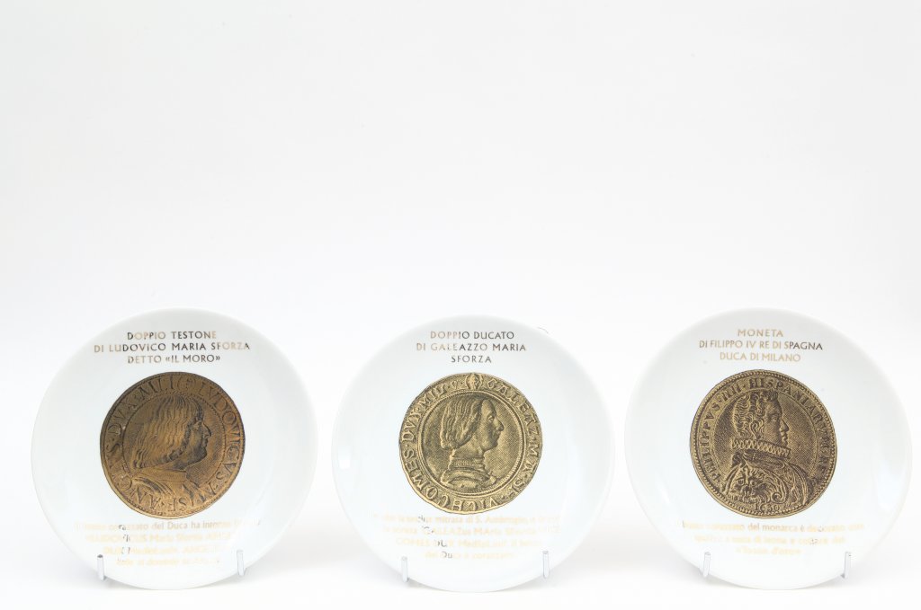 Tre piatti della serie "Monete del Ducato di Milano", 1973.
