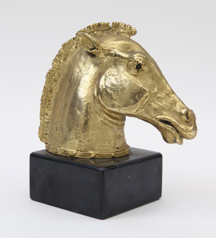 UNA TESTA DI CAVALLOBronzo dorato su base in marmo. Firma impressa non...